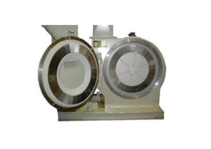 Pulverizing of brittle or tough plastics in a closed looped system for free flowing powders to be used for extrusion, rotomolding, and coating applications. Method of Operation The material in granular form is fed with a vibratory feeder from a feeding hopper to the pulverizer. The material is pulverized between the two rings of segments mounted on carrier discs, then air conveyed to a screening machine. The coarse material is recycled to the pulverizer for further size reduction. The desired powder is diverted to fill bags or containers, or conveyed to silos. A one pass system, without a sifter is also available.